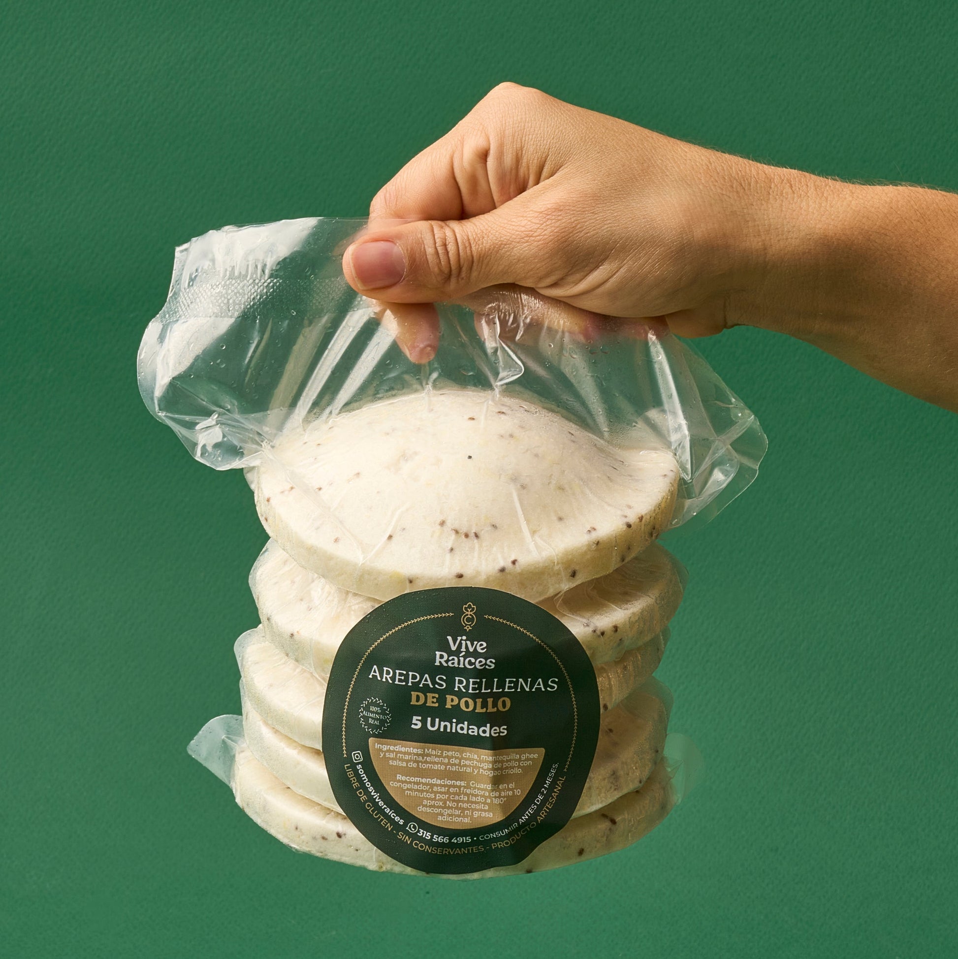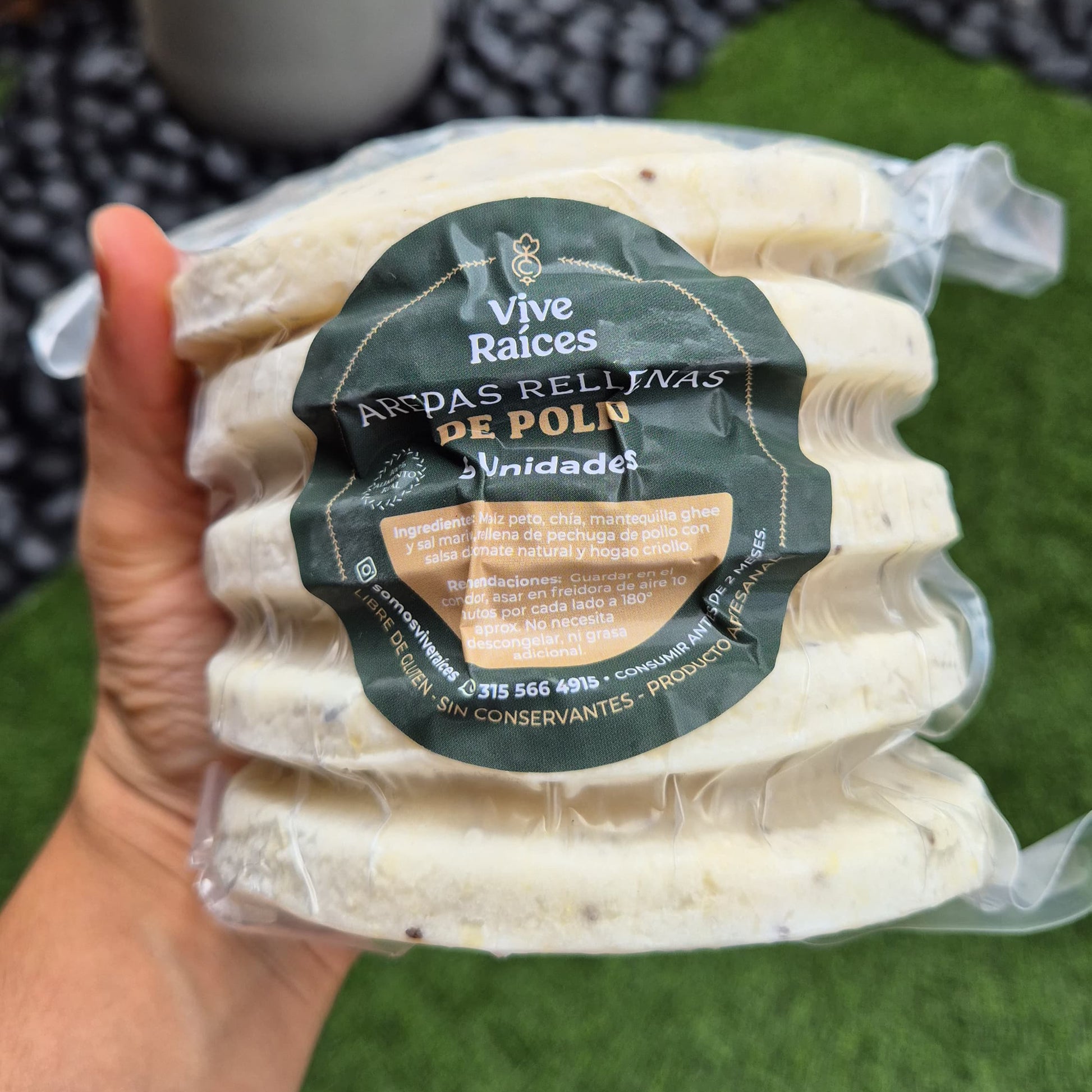 Maíz peto, semillas de chía, ghee y sal marina. Rellena de jugosa pechuga de pollo con hogao criollo hecho en casa.