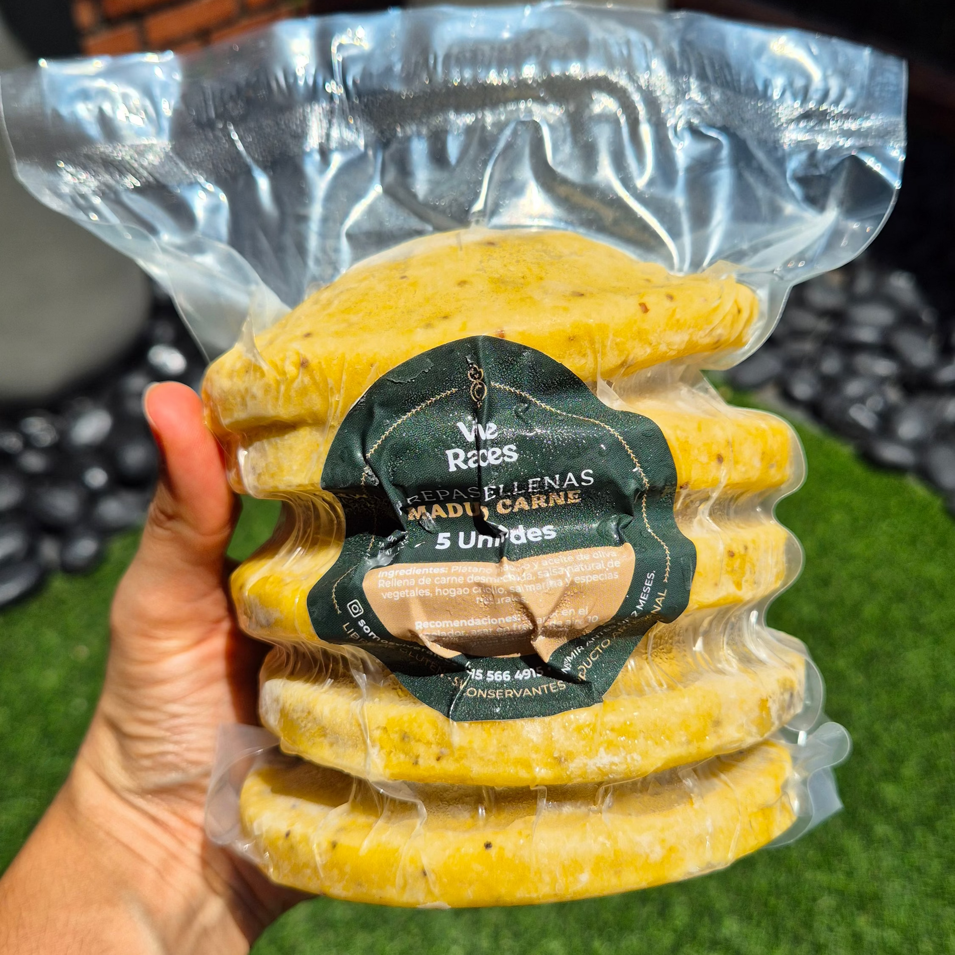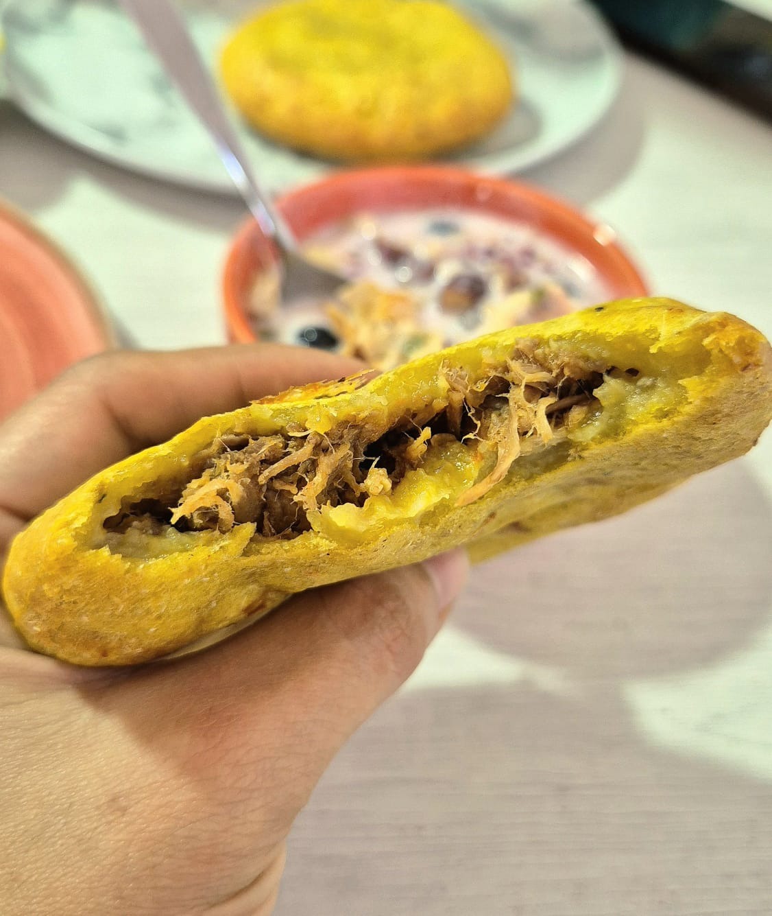 Una arepita elaborada con 100% plátano maduro (sin harinas ni almidones) y aceite de oliva extra virgen, rellena de jugosa carne desmechada con hogao criollo.