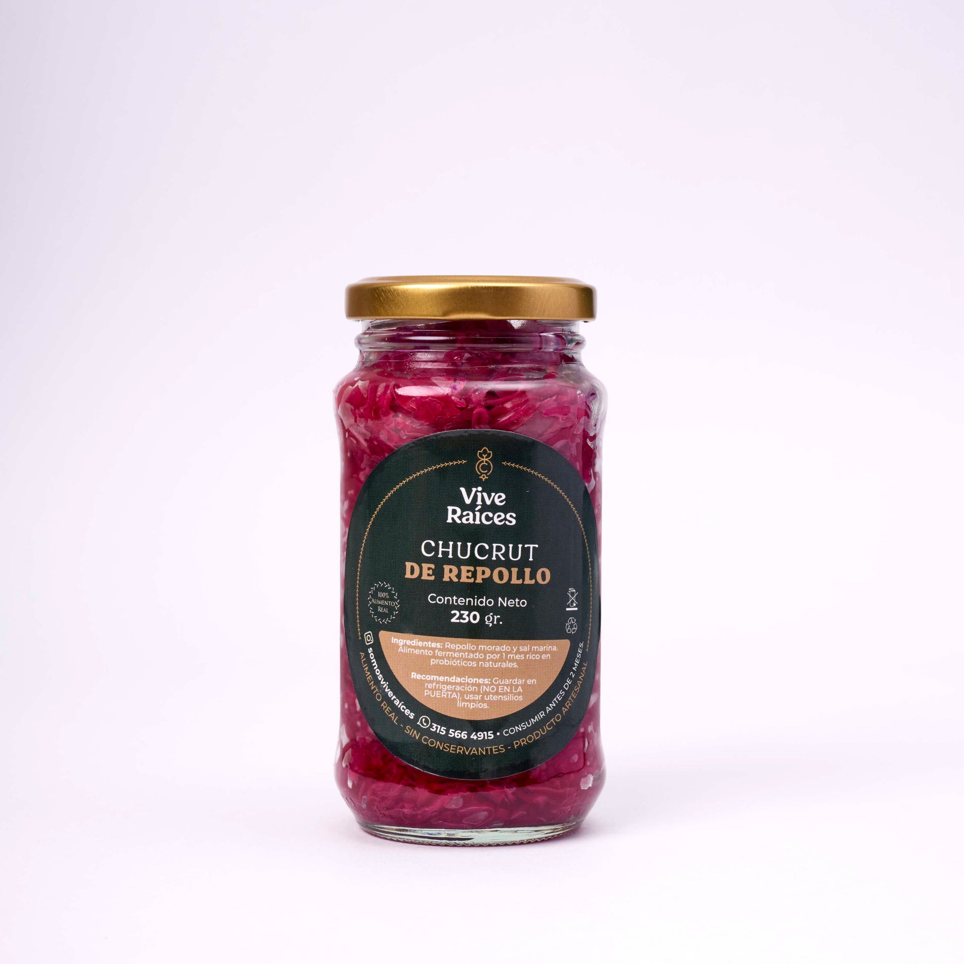 Nuestro chucrut morado es un alimento vivo, rico en probióticos naturales que favorecen la salud intestinal, fortalecen el sistema inmune y mejoran la digestión. Además, el repollo morado es fuente de antioxidantes, vitamina C y fibra.