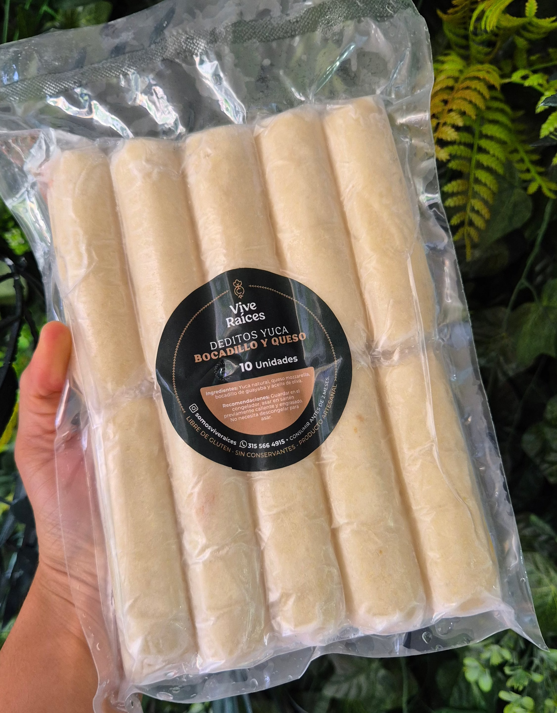 Ingredientes: Yuca natural, ghee y sal marina. Rellenos de queso mozzarella y bocadillo.