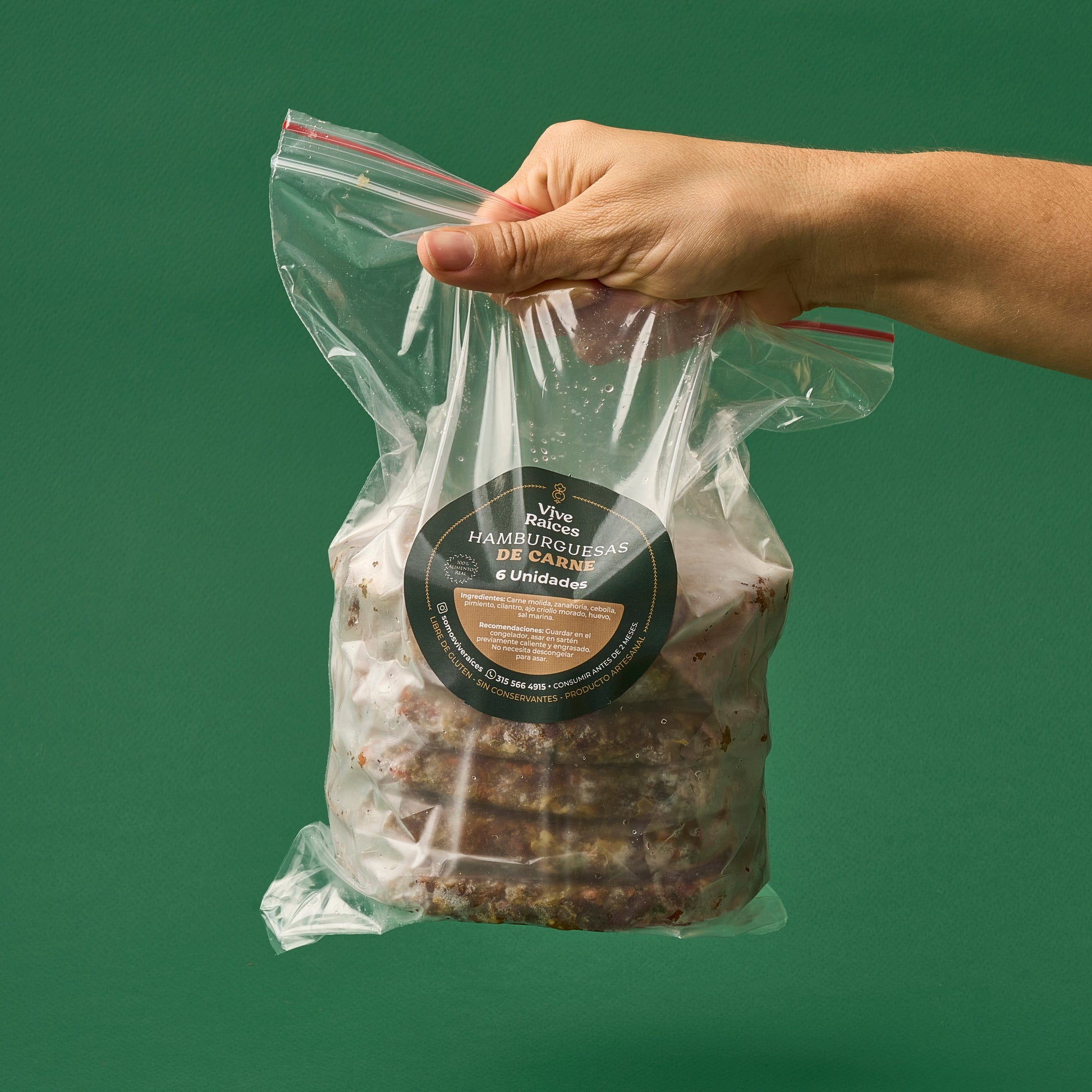 Carne de res molida, zanahoria, cebolla, pimentón, cilantro, ajo criollo morado y sal marina.
