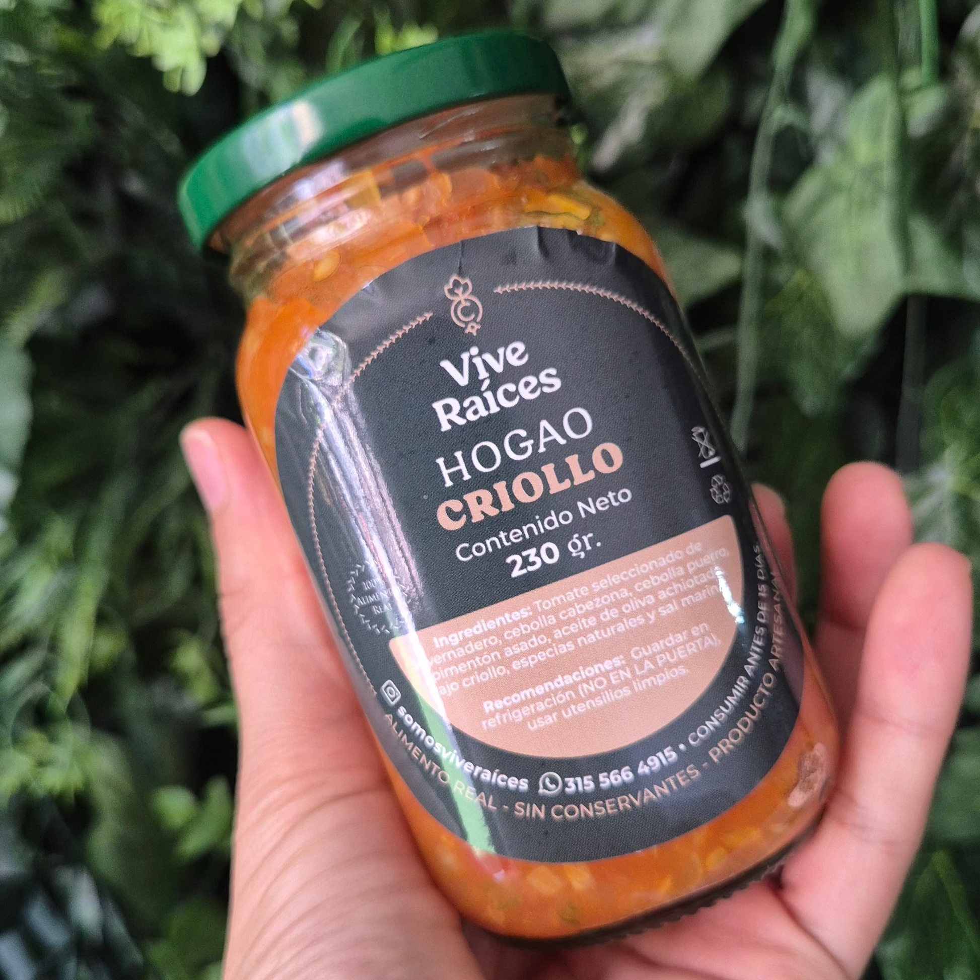 Cebolla cabezona, cebolla puerro, tomate de invernadero, ajo criollo, especias naturales, cúrcuma, semillas de comino, sal marina y aceite de oliva achiotado.